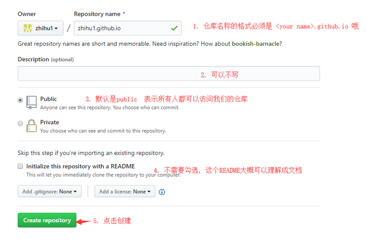 比如我注册的名字是 zhihu1,所以这里我创建的仓库的名字必须是 : http://zhihu1.github.io
