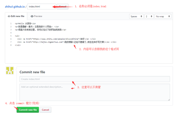 5,新文件的名字不可以乱写哦,必须是 index.html,这里大家都一样都写这个。(题外话:静态http文件托管服务的默认访问文件就是index.html)