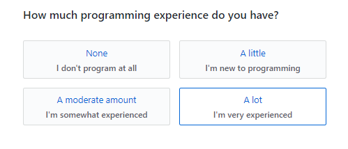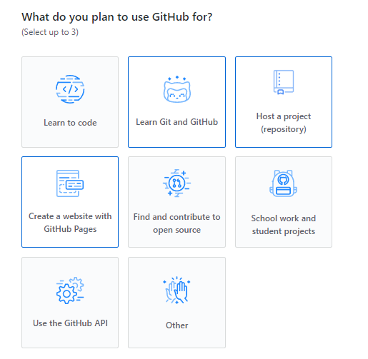 后面还会有一些步骤,大概意思就是问你想用Github做什么,你对Git的熟练程度,(感觉像是moba游戏新手调研都会这么做)因为Github网站迭代的原因可能会稍有不同。比如笔者这里试的时候是这样子的。