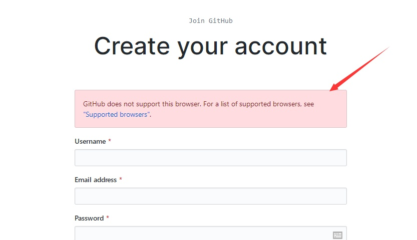注意:我点击sign up 之后,弹出如下页面,箭头所指提示 GitHub 不支持这个浏览器(我用的是搜狗),我看了一下,支持 Chrome,Firefox,就用了 Firefox