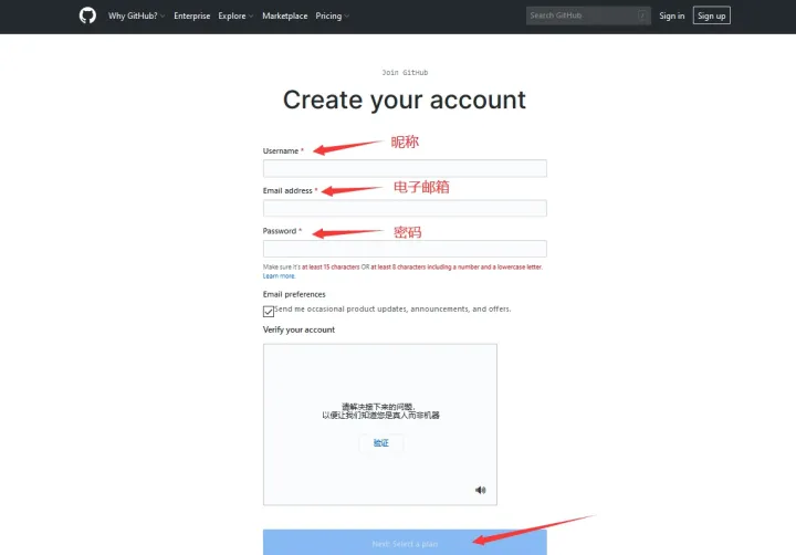 填完上图中的昵称、邮箱地址(QQ/163邮箱都行)、密码(确保至少有15个字符或至少包括数字和小写字母的8个字符),再验证一下,点击 Next: select a plan, 进入如下页面: