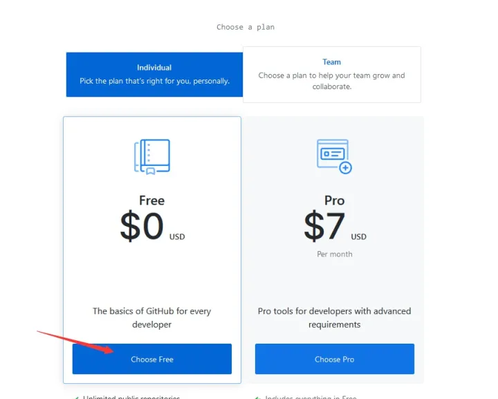 3.如上图所示,在选择账户类型这里有一点需要我们注意,那就是:GitHub 的仓库分为两种,一种是public repositories公开免费版,一种是private repositories私有付费版。其中,免费版是完全公开的,而私有版一般是由企业或者不愿公开仓库的个人用户购买,在这里,我们选择免费版就可以,然后点击 Choose Free,进入如下界面: