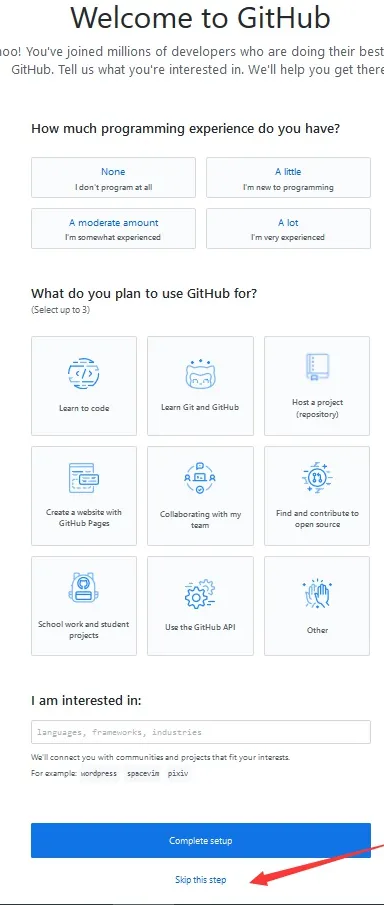 4.如上图所示,有一个问卷调查,填不填都无所谓,如果填完就点击 Complete setup, 如果不想填就点击 Skip this step 跳过,不管选择哪个都会进入如下页面: