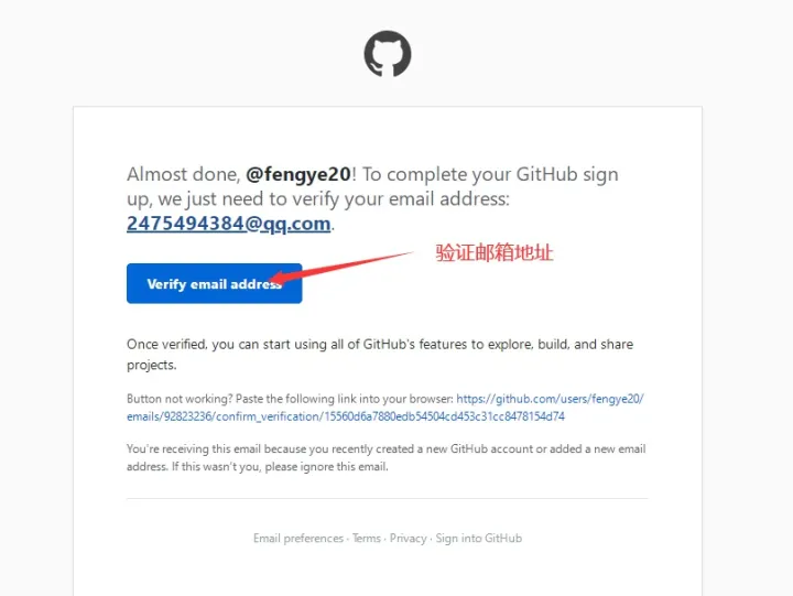 5.接下来就是验证邮箱地址了,GitHub会发送邮件到你刚才填的邮箱地址,例如我填的是QQ邮箱,登录QQ邮箱,打开收到的邮件,如下图: