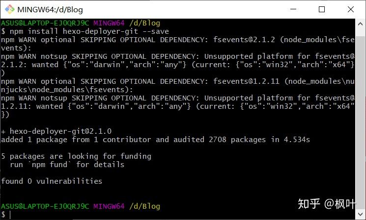 然后回到 Blog 文件夹中,打开 Git Bash,安装Git部署插件,输入命令: