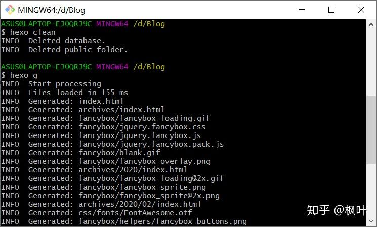 hexo g #生成网站静态文件到默认设置的 public 文件夹(hexo generate 的缩写)