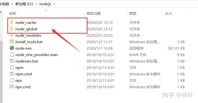 在 nodejs 文件夹中新建两个空文件夹 node_cache、node_global,如下图: