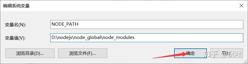 设置环境变量:win10系统–>打开控制面板–>系统–>高级系统设置–>环境变量,然后在系统变量中新建一个变量名为“NODE_PATH”,值为“D:\nodejs\node_global\node_modules”,如下图: