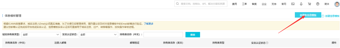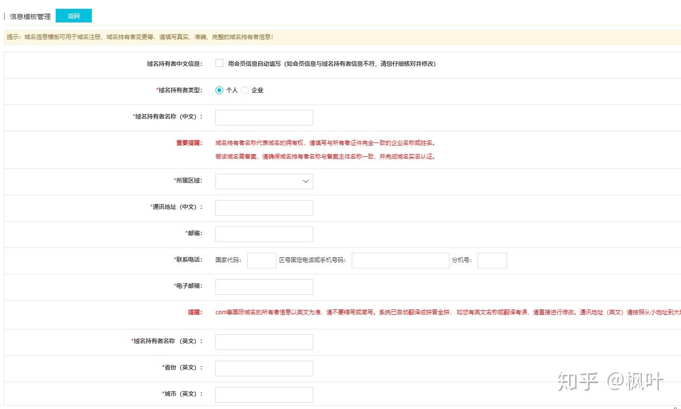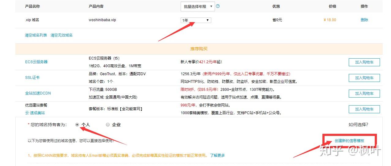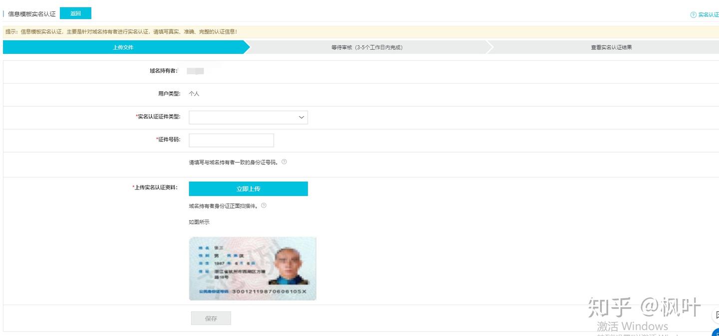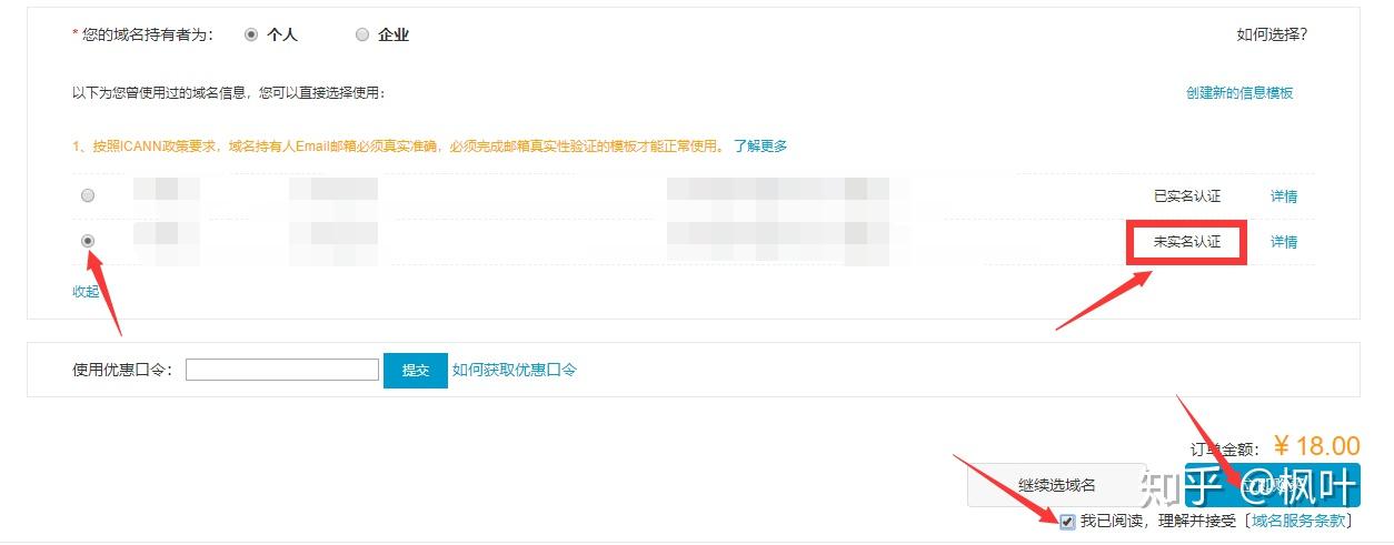 具体过程我就不详述了,以免又被当成是广告信息给我把号都封了。就说一下实名认证,选好要购买的域名后,需要创建一个个人信息模板,创造好后等待认证,此时可以直接付款购买,购买完成后等待认证就可以了,时间也不长,我的几分钟还是十几分钟就给我发短信认证成功了。
